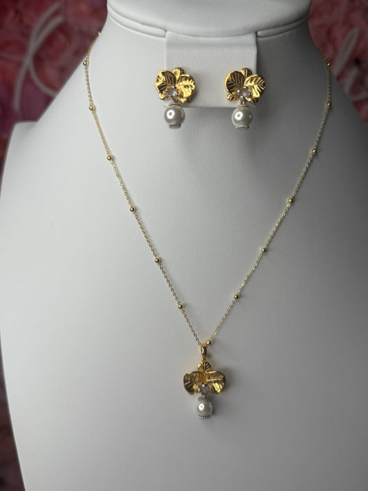 Orchid Pearl Drop Wedding Earrings and Necklace Pendant • Two Tone Phalaenopsis Orchid Jewelry