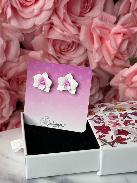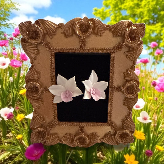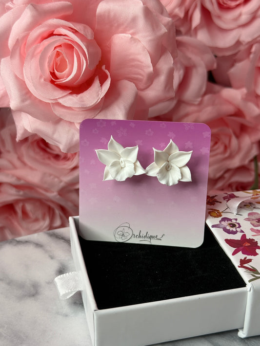 White Petite Cattleya Orchid Studs • Unique Handmade Floral Jewelry