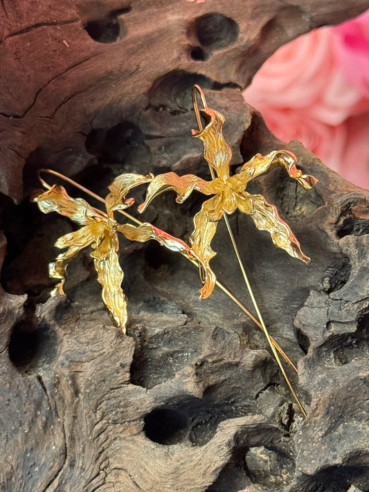Meticulous: Schomburgkia Gold Orchid Flower Dangle Earrings