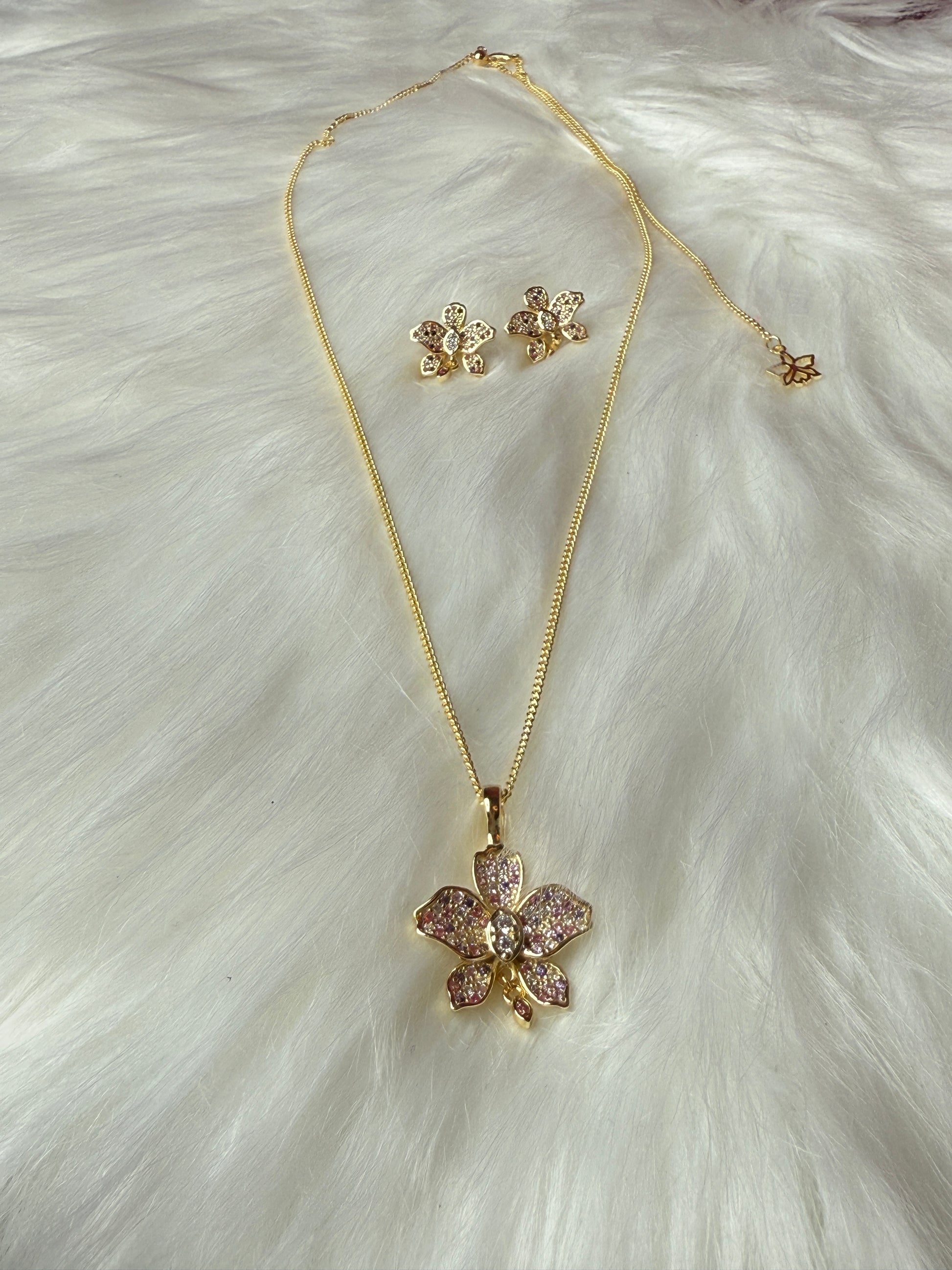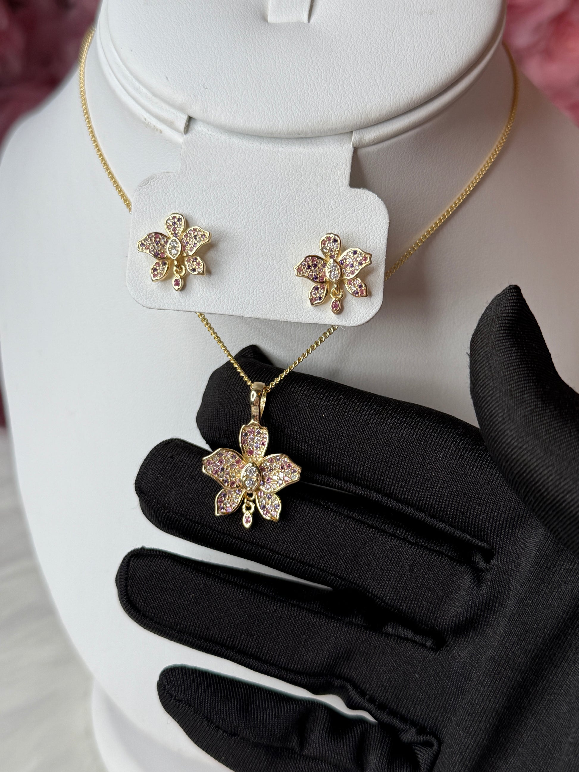 The set includes a matching necklace and a pair of delicate dangle earrings. The 20mm pendant, adorned with a stunning orchid motif, hangs gracefully from a 24-inch necklace. The matching earrings are 15mm, featuring a delicate zircon drop.