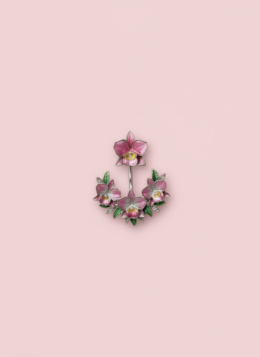 Botanical Scale & Depth: Features a bold 12mm Cattleya stud paired with a shimmering jacket of three smaller 8mm orchids, creating a realistic, blooming vine effect.