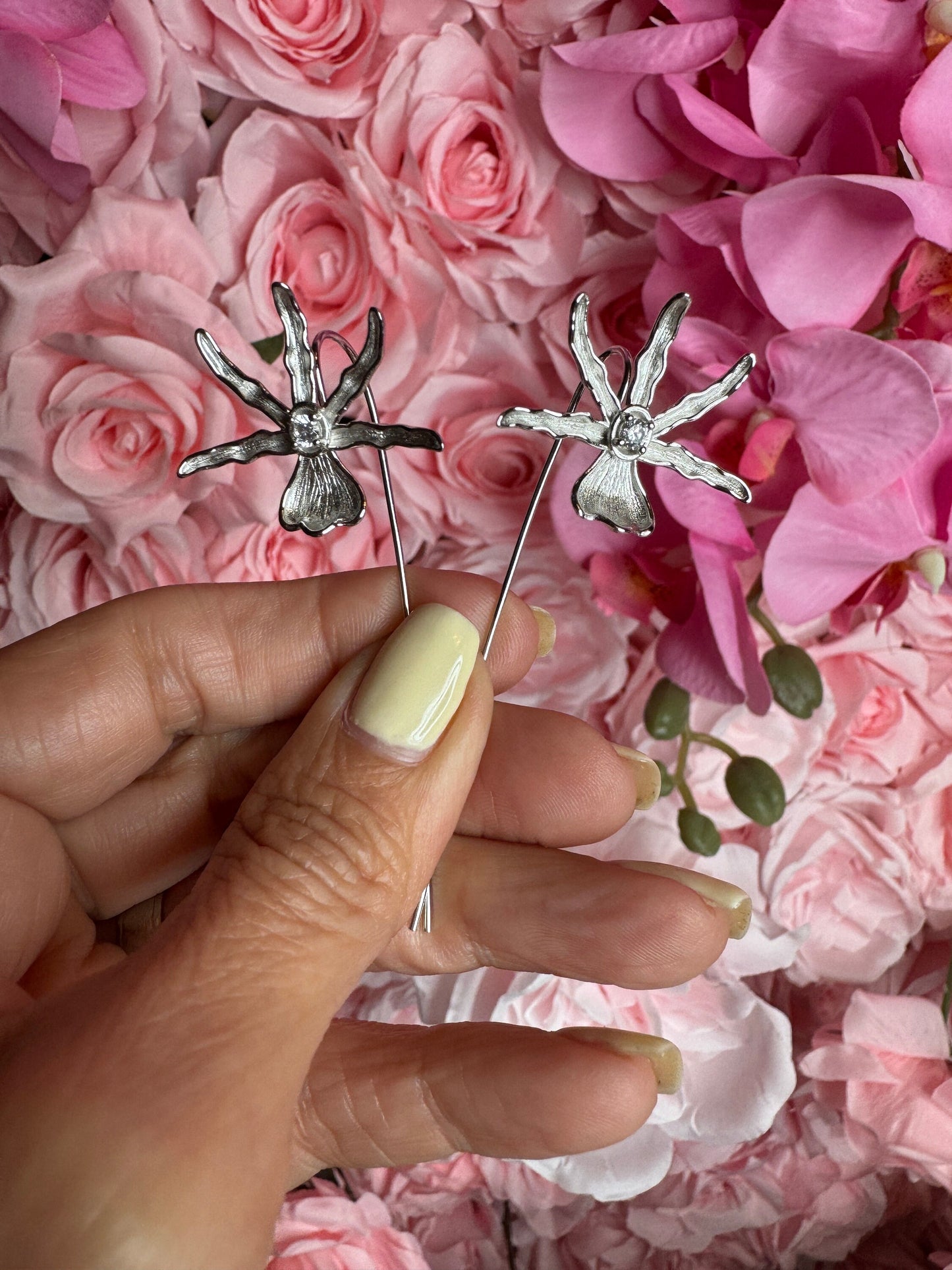 "Ascension" embodies the captivating beauty of the Schomburgkia orchid. These exquisite dangle earrings showcase the orchid's unique, curvy petals in a delicate and elegant sterling silver silhouette. The added arching hoop creates a striking visual element, reminiscent of the orchid's natural growth pattern.
