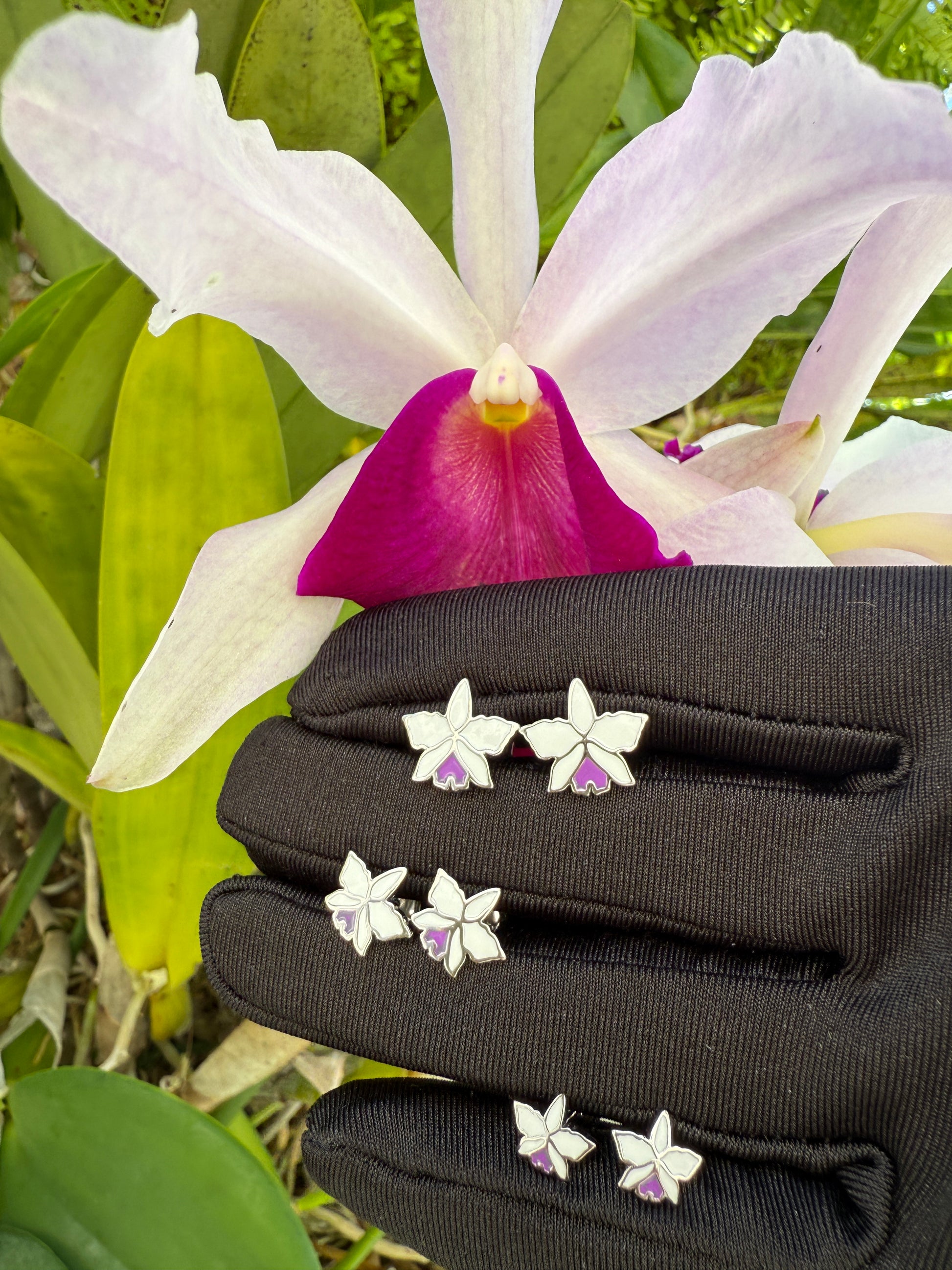 Celebrate the beauty of nature with our Cattleya Orchid Stud Earrings. These stunning studs are crafted with intricate enamel work, showcasing the pure beauty of a white orchid with a striking purple labellum. The labellum is uniquely shaped as an upside-down heart, making these earrings as romantic as they are charming.